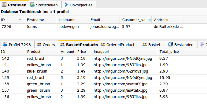 Dit is collectie 'BasketProducts', waarin de losse producten staan. In veld 'BasketID' staat het ID van de mand zoals we die in 'Baskets' vinden. Verder staat de prijs en een locatie van een afbeelding van het product in het subprofiel.