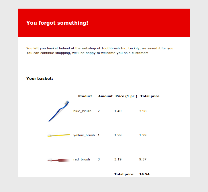In dit artikel wordt een een document opgebouwd dat kan worden ingezet bij een verlaten winkelmandjes email campagne. We gaan hierbij uit van een werkende integratie tussen de webshop van het voor dit artikel bedachte Tandenborstel BV en Copernica, waarbij de lege winkelmandjes dus reeds in een database in Copernica te vinden zijn. Hieronder zie je enkele afbeeldingen van de database van Tandenborstel BV.