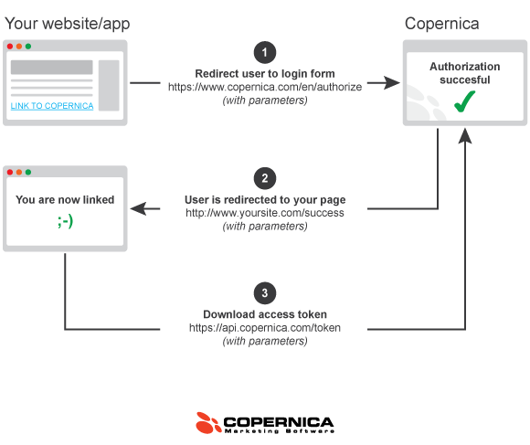 Because we use this OAuth2 protocol, you need to take two steps to get access to the API: you first have to register your website of app with Copernica, and then you have to give your application access to your account. After you've taken these two steps (which you can do both via the www.copernica.com dashboard) you will be handed an access key that you can use to access the REST API.