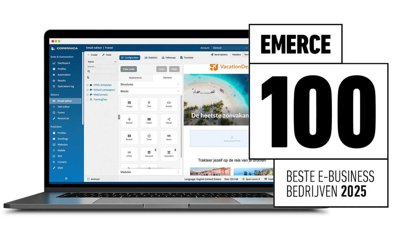 Copernica is the email specialist offering various software solutions for every type of organization. Whether you want to send email marketing campaigns, reliably deliver transactional messages, or maintain full control over your email infrastructure: we have a solution that fits your needs. Our technology has helped organizations achieve higher conversions and increased revenue from email for more than 20 years.